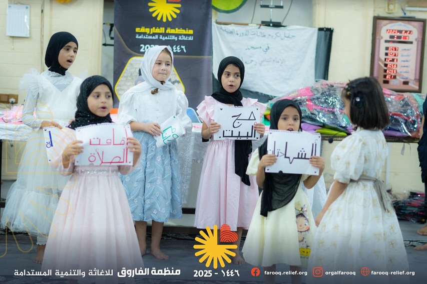 تواصل منظمة الفاروق للإغاثة والتنمية المستدامة دعمها المتواصل لحفظة القران الكريم، حيث رعت حفل تخرج الدورات الصيفية لتحفيظ القرآن الكريم والسنة النبوية في جامع الشافعي للبنات في منطقة الرشيدية ، ووزعت الهدايا على الطالبات لتشجيعهم على الاستمرار في طريق الخير