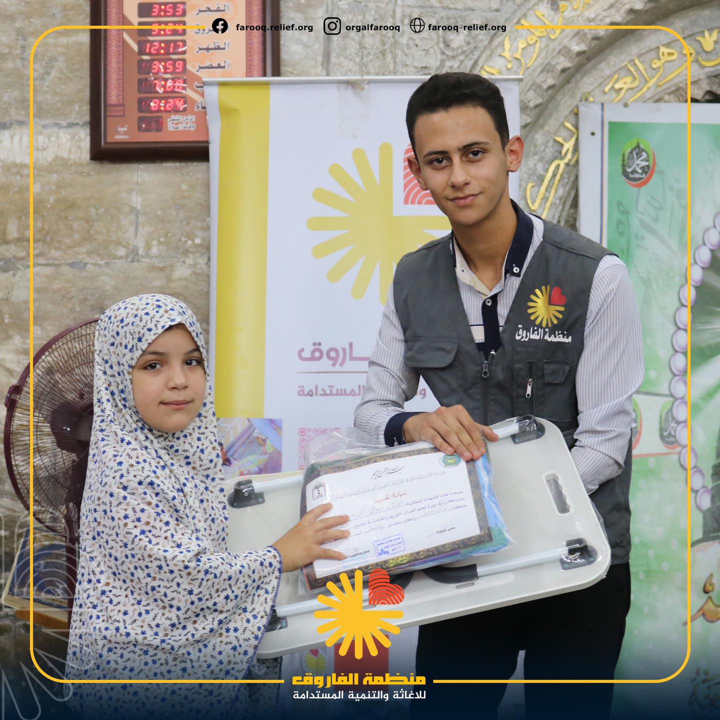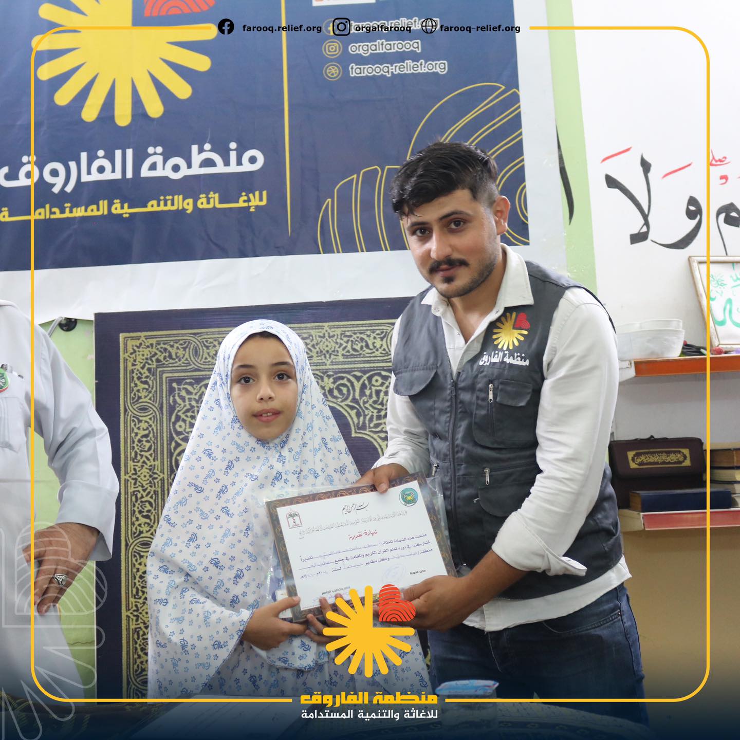 ضمن اهتمامها بدعم الطلبة المتميزين وتشجيعهم على مواصلة مسيرتهم في حفظ كتاب الله، قامت منظمة الفاروق للإغاثة والتنمية المستدامة بتوزيع مكافآت مالية على الطلبة المتميزيين من قسم الدراسات الإسلامية ( الو...